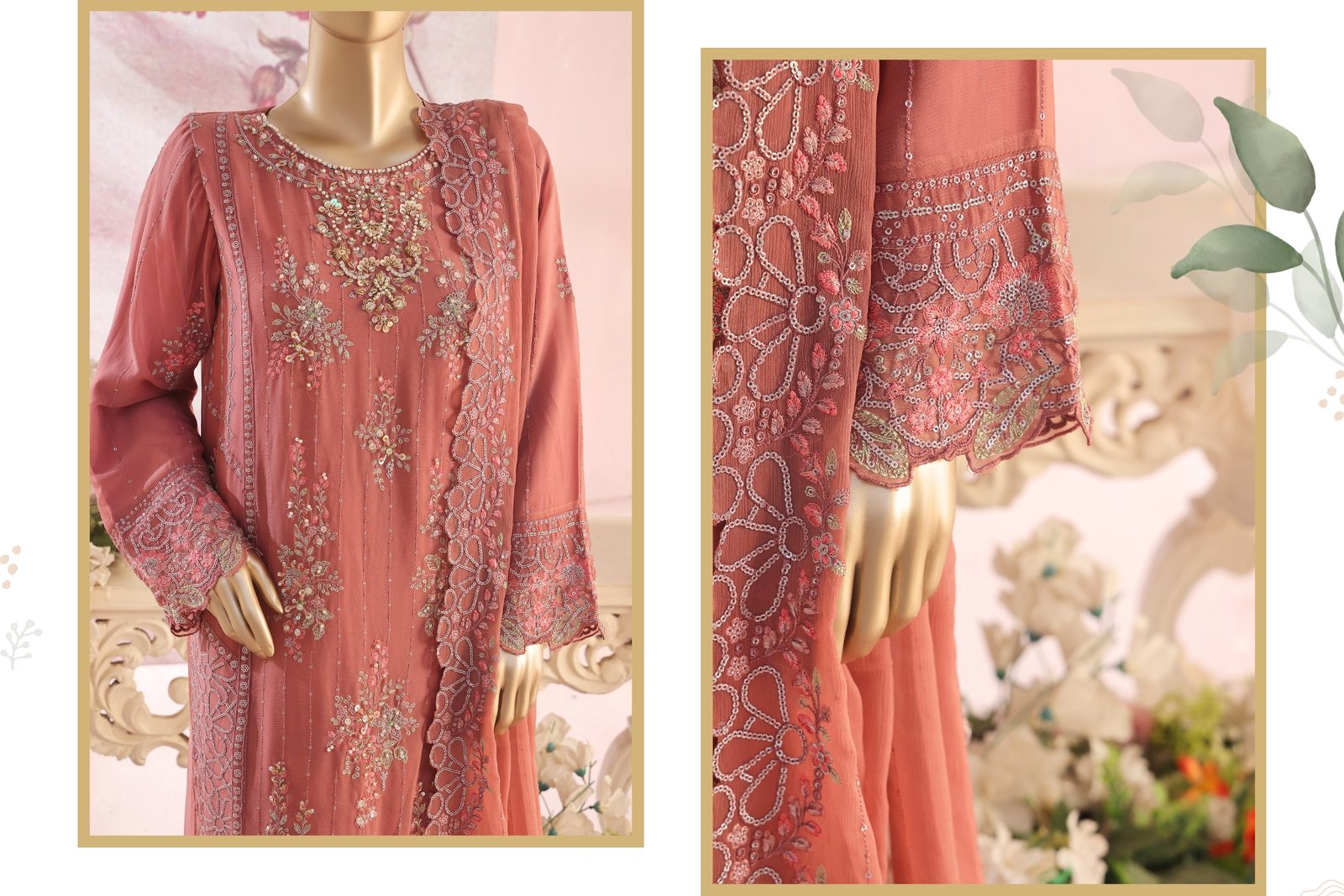 The soft premium chiffon fabric drapes gracefully, creating an elegant silhouette perfect for special occasions. The outfit is complemented by a matching embroidered chiffon dupatta and a coordinating dyed trouser, completing the luxurious ensemble.
