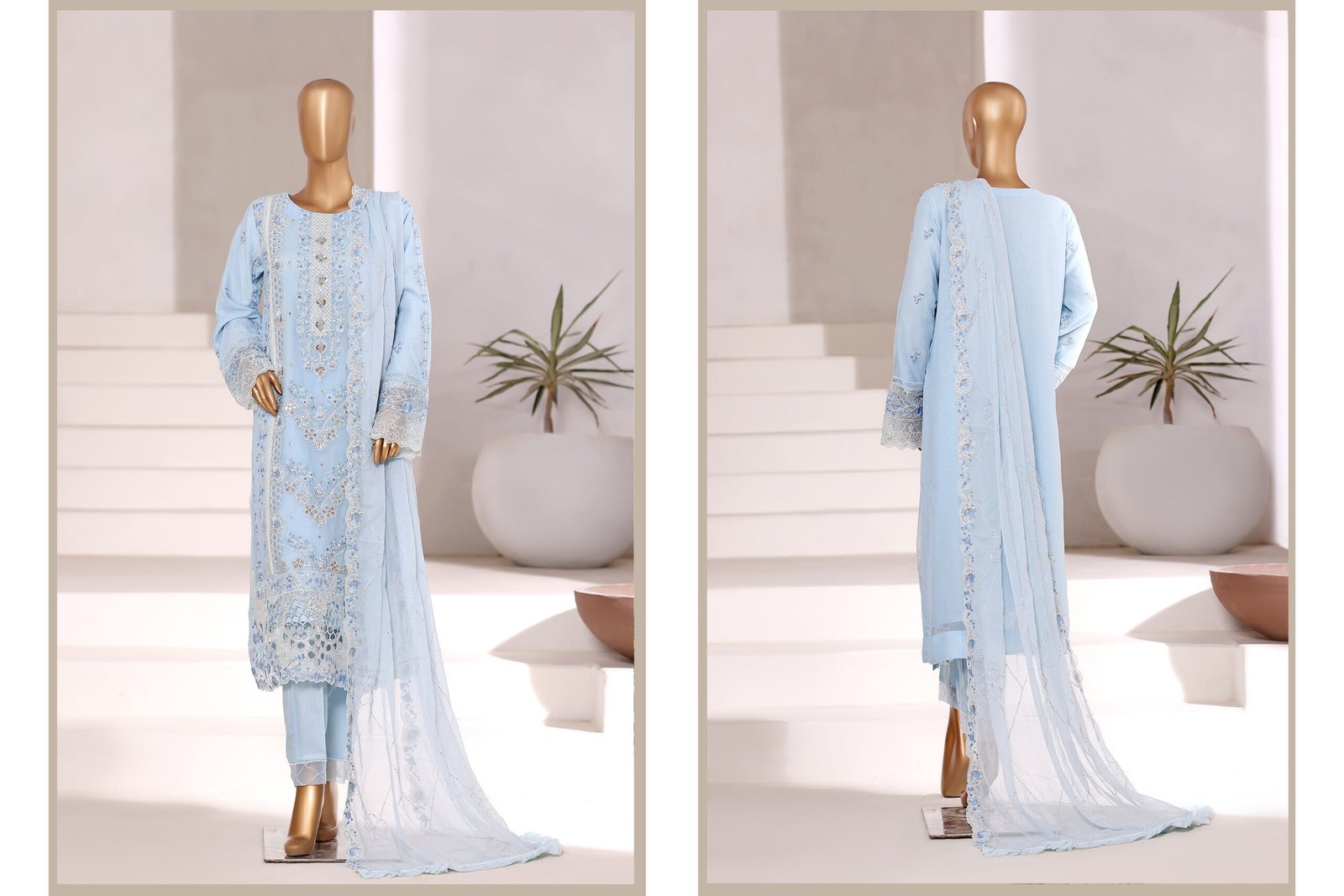 Ideal for Eid celebrations, weddings, festive gatherings, and evening events, this outfit combines comfort with high-end design. Since it is unstitched, it allows you to tailor the outfit according to your preferred style and fit.