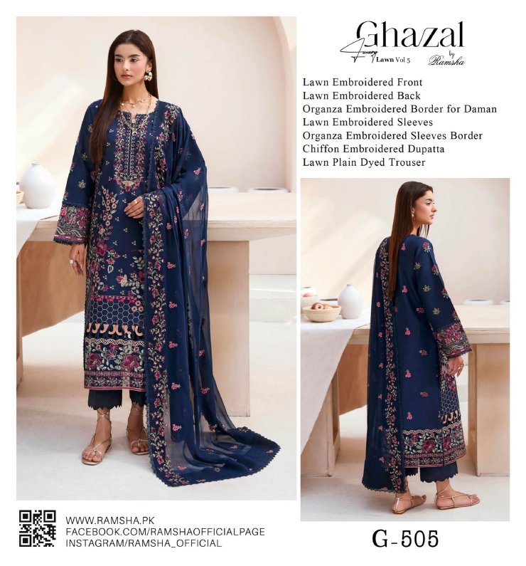 Experience timeless elegance with the Ramsha Ghazal Luxury Lawn Vol 5 collection, designed for women who appreciate sophisticated embroidery and premium fabrics. This luxury lawn ensemble features finely embroidered details on the shirt along with delicate organza borders that add depth and refinement to the overall design.